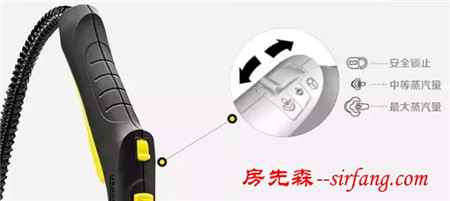 手柄处还带有可调节蒸汽量的开关,对污渍更为顽固的地方,可增大蒸汽量进行清洁。。。