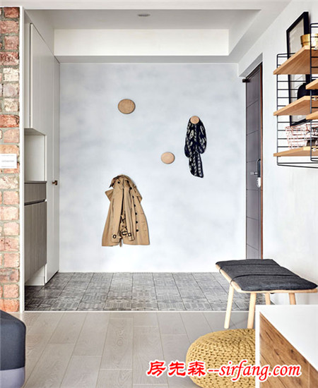 玄关除了必要的衣帽鞋柜以外,还有一面只粘了几个挂钩的墙,实用性一般但很有创意感。