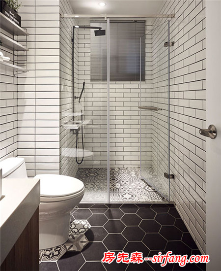 来到卫生间,墙面的瓷砖是不是看上去很眼熟呢?因为刚刚在厨房里见到过~地砖的设计很有意思,干湿区域分别用了不同图案的两种砖,视觉上有了清晰的界线。