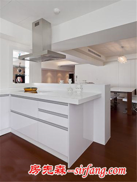 客厅望向厨房,开放式白色基底的洁净厨房,以电陶炉取代瓦斯炉,将料理的面向转到餐厅的方向可以兼顾家人的互动。