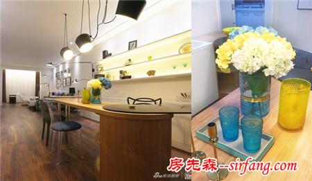 是在太酷啦!餐厅设在入门右边,与客厅连接,一组简易的灯泡确立了餐厅的区域,为满足业主藏书的爱好,餐厅的背景墙与一边的餐椅的镂空设计都设有藏书的空间,背景墙错落有致的收纳架分布在整面墙,琳琅满目的艺术品与书籍点缀在其中,冰箱的嵌入更使餐厅背景墙变得强大起来。也是餐厅的颜色变得丰富温馨起来。