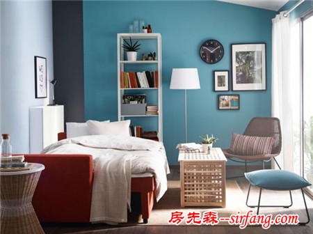 床头方向刷了一整面水蓝色,但是床头高饱和的大红色面积很小,撞一撞反而锦上添花。