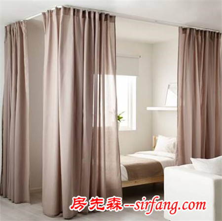 再看这个窗帘,同理也是起到分区功能。色彩上也和床品相呼应。