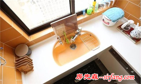 问题:“房子太小,特别是餐厅放下饭桌之后,彻底没有空位放餐边柜了,可是杂物很多,有什么法子?”灵感:缩小原本厨房的门洞,封起多余出来的另一半墙面,并且把餐边柜镶嵌进去,相当精致。
