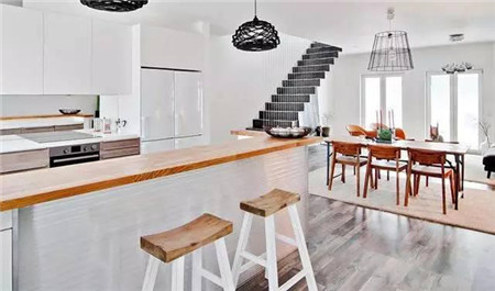 现代化的开放式十分便捷,以木质元素为主的设备让整个家看起来自然,同时木质的橱具与餐桌的颜色和客厅点缀物的颜色相类似,用适当的植物点缀更为清新。
