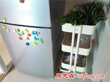 在厨房里放置当天要用蔬菜水果,既节约空间,又方便拿取,洗菜做菜时可以推到洗菜盆附近,平时也可以推到阳台通通风。家里小朋友闲着,还推着它当玩具玩,一举多得。