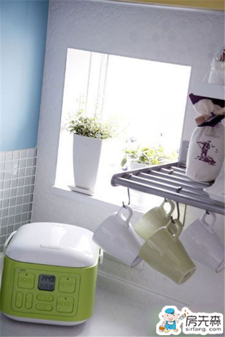 绿色、白色的电饭煲,可爱的色彩,仿佛置身于童话世界中一样,天真可爱。白色,淡黄色的马赛克杯,悬挂在金属架子上,不仅节约空间,而且可以避免不小心将杯子碰到地上,非常方便。白色的花盆,高挑的样式,再种上绿色的小叶植物,给厨房增添了新鲜的色彩。