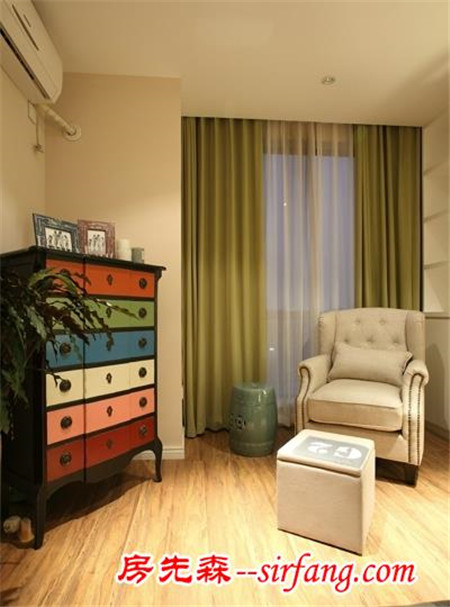 一个懒人沙发,在工作至于,午间小憩时舒服的躺在上面,是不是一件很惬意的事情呢。彩色的储物柜,给素雅的卧室带来一丝丝生气。