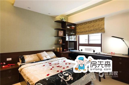 利用窗户到床之间的距离,转角空间可以收纳物件,可以变为阅读空间。靠窗看书,采光也好,也让生活充满诗意。金色的床品搭配深木色桌柜,使卧室显得典雅、大方。