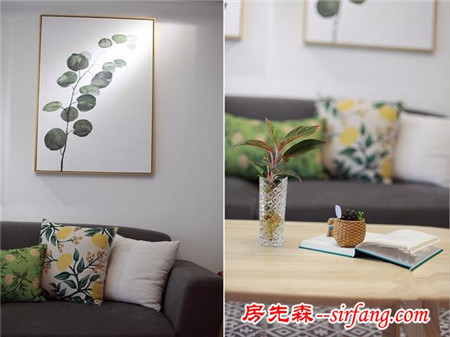 极简的两幅植物装饰画,与木质家具一脉相承。清新图案恰好与沙发抱枕相呼应,自然而美好。
