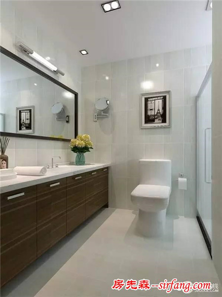 白色暗纹砖石墙面易于打理,并与地砖形成简洁之风;褐木条纹方形盥洗台色泽深沉,与白色大理石盥洗台镌刻着现代卫浴时光,富有生活更多的品质感。