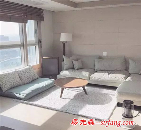 客厅面积不大,但足够了啦,因为老公喜欢小清新,所以家里的格局都是按照浅色调来布置,包括这个布艺沙发、毛绒地毯还有茶几。