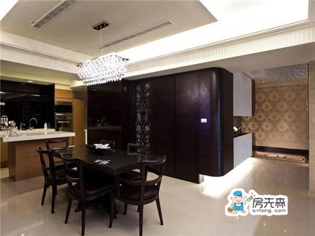 其实餐厅侧旁还设有公共卫浴,但设计师同样为了风水问题,将之利用黑色门板,巧妙隐藏于后方,不轻易被发现,让机能的独立性更加明确。