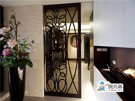 设计师通过半穿透式的玄关,解决了穿堂煞的状况。同时在玄关区域加上壁纸、贝壳马赛克砖与镜面,去除了生硬感,让玄关增加更多丰富性的创意。