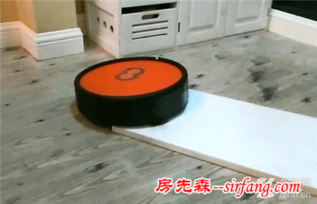 卧室床架离地面高度13cm左右,瓦力轻松进入,但碰到意外情况,装修时多出来的一块木板放置在床底,厚度2cm。只听见瓦力在床底不断发出碰撞声,赶紧手机打开手电筒查看,发现已经翻到木板上,开始清扫木板了。越障能力相当不错!