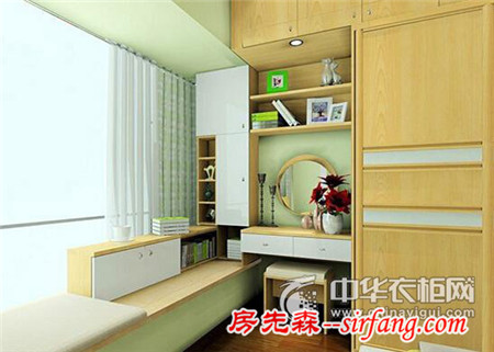 编辑点评:这款飘窗装修设计看起来十分清新自然,飘窗装修设计的时候将衣柜与梳妆台组合,搭上飘窗,显得功能强大。两个床头柜的搭配,完美贴合。这样的设计让飘窗空间得到了完美的利用,没有浪费空间。